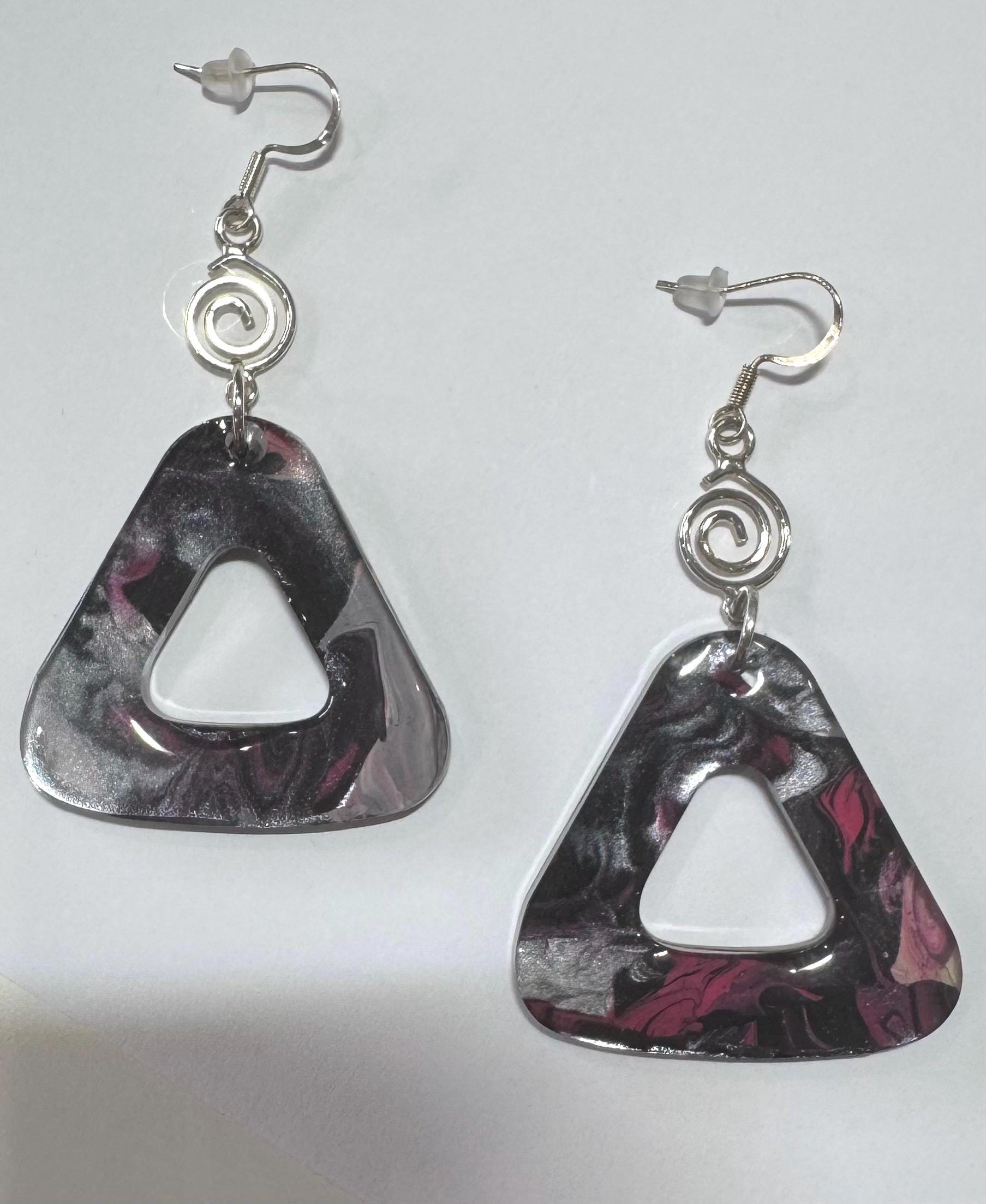 Resin Dangle Earrings with Striking Acrylic Paint Design in Black, Pink, and Gray